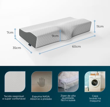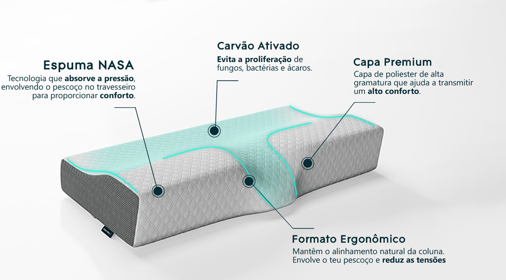 Travesseiro que cuida do seu pescoço, mantém o alinhamento correto da coluna e reduz dores ao acordar.