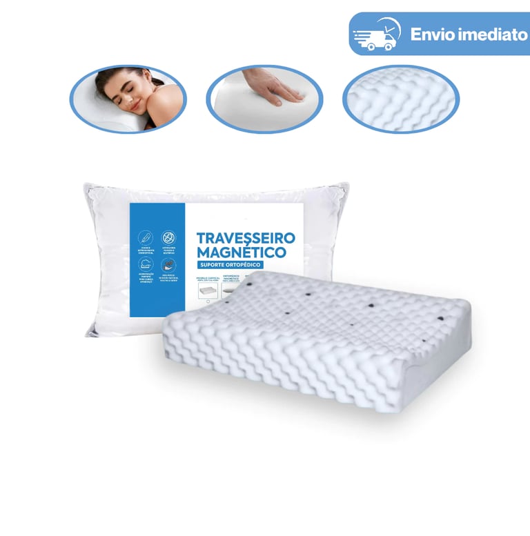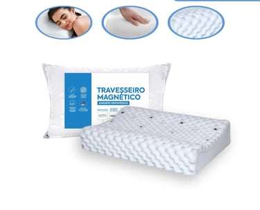O travesseiro é feito em malha, para dar maior conforto. Contém pastilhas magnéticas e infravermelhos que atuam no organismo por meio da magnoterapia, amenizando dores corporais, massageando e estimulando a circulação sanguínea.